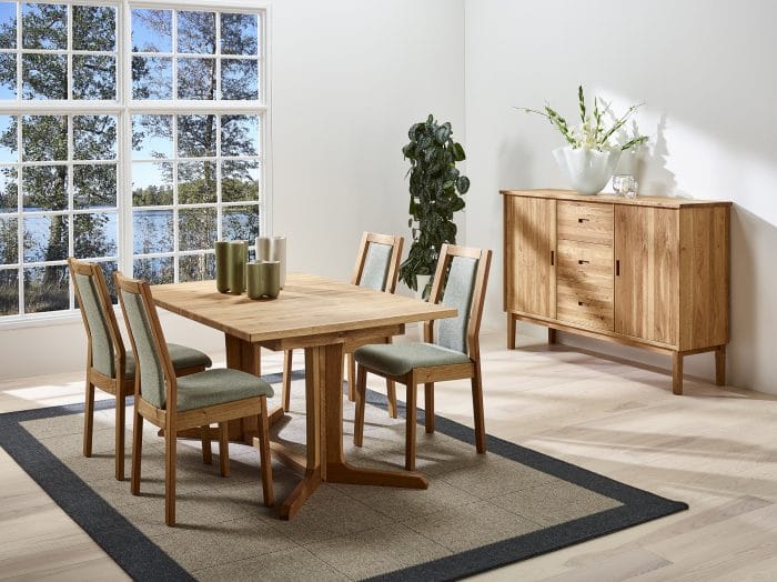 Bordpladerne er fremstillet i 32 mm massivtræ og er forsynet med dobbeltpløjninger, der styrker holdbarheden og desuden er en smuk detalje. Der er ligeledes lavet udfræsninger til kuffertbeslag under bordplader med tillægsplader samt indfræset greb, så man let kan trække pladerne fra hinanden og ilægge tillægsplade.